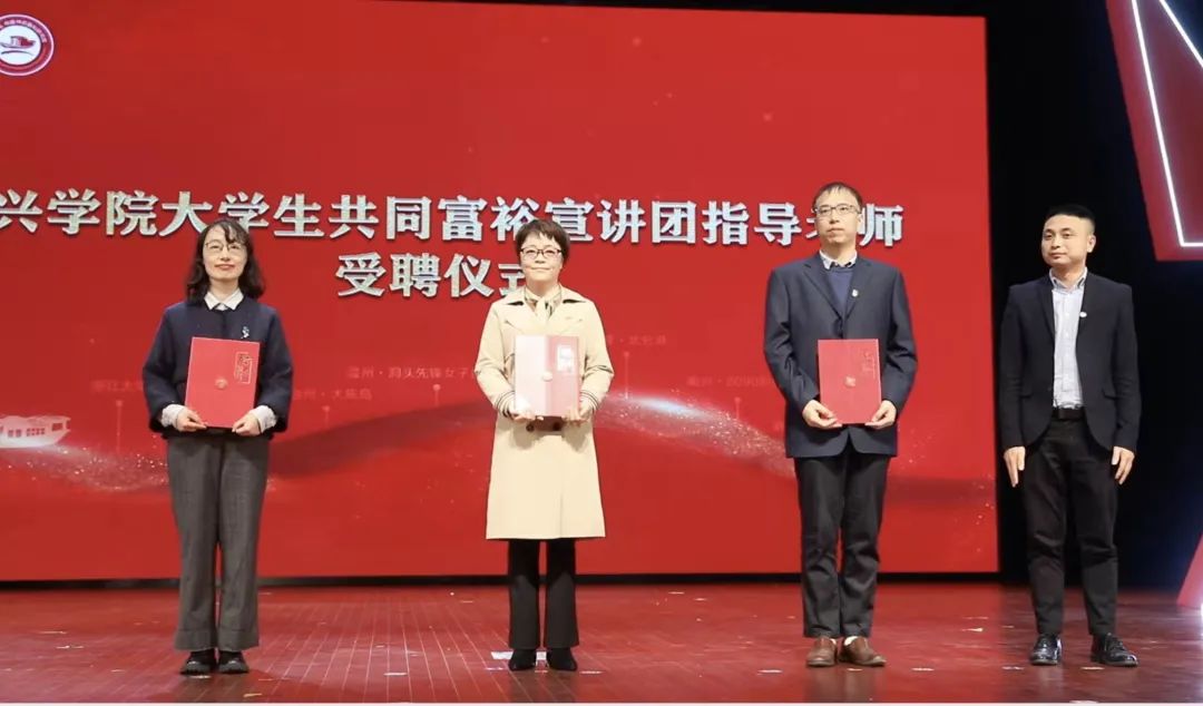 在嘉兴学院大学生共同富裕宣讲团成立仪式上,共青团浙江省委学校部副部长章豪锋为宣讲团指导教师颁发聘书,嘉兴学院党委副书记钱方明为宣讲团成员授旗。