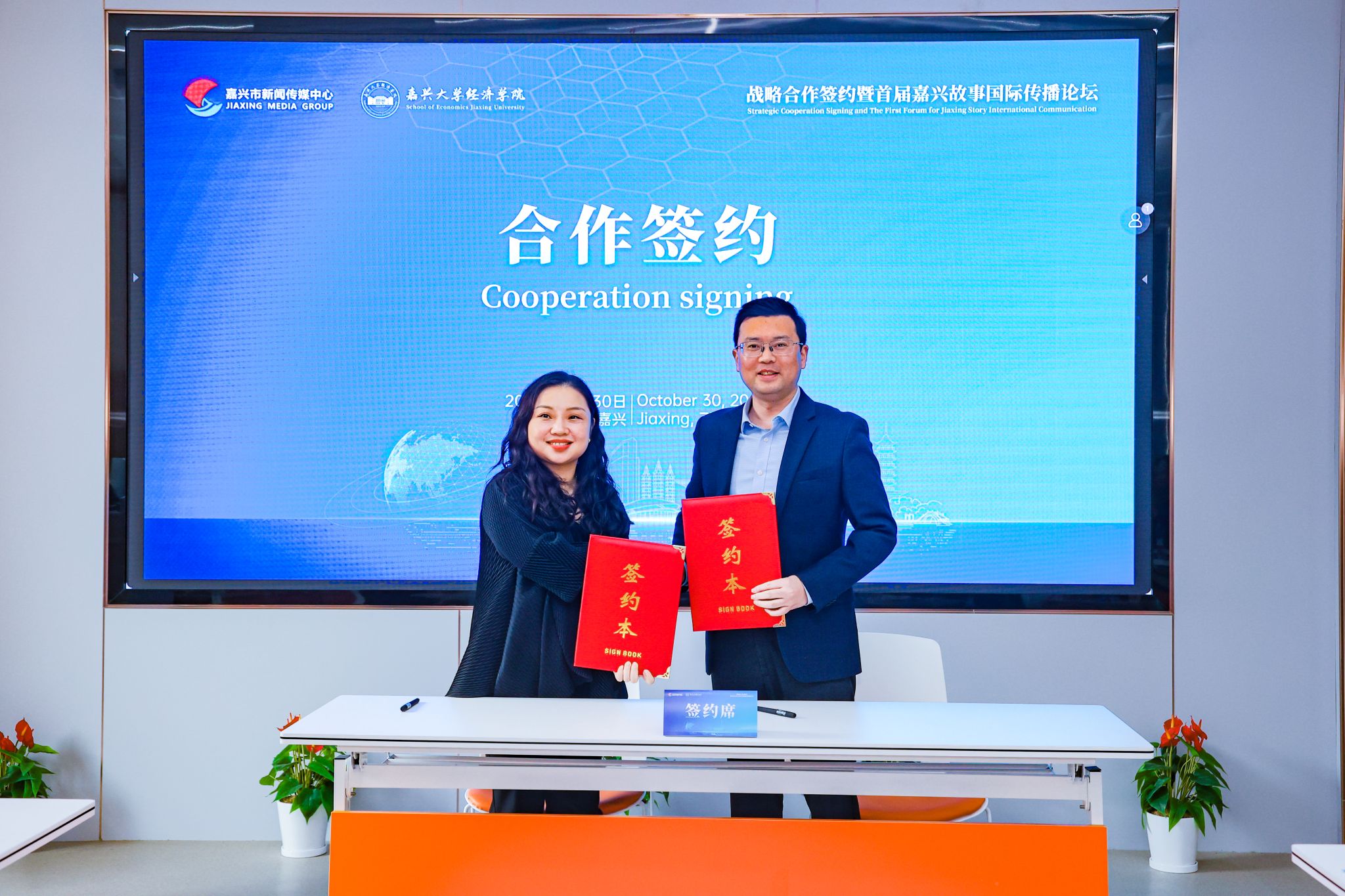 学院院长文雁兵与嘉兴市新闻传媒中心副主任、副总编辑杨洁代表双方签署了战略合作协议。