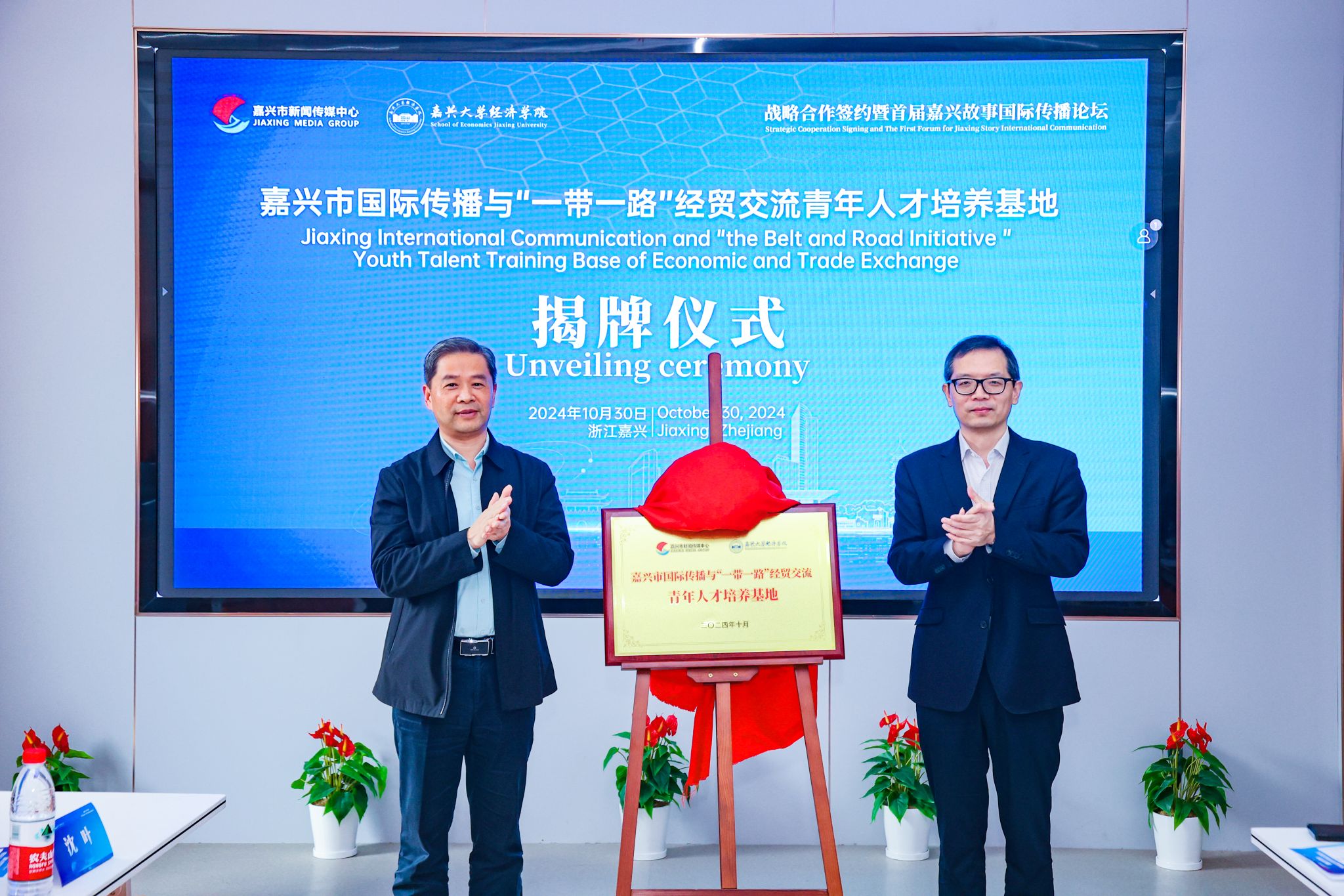 副校长周宏伟与嘉兴市新闻传媒中心党委书记、主任沈炳忠共同为“嘉兴市国际传播与‘一带一路’经贸交流青年人才培养基地”揭牌。