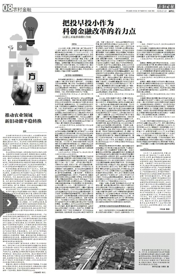 特聘教授、嘉兴地方金融发展研究院常务副院长汤钟尧在《金融时报》发表研究文章《把投早投小作为科创金融改革的着力点》,以浙江禾城农商行为范例,总结出“培养投早投小的专业人才,提升投早投小科创金融服务能力”“完善专项考评机制,激励投早投小科创金融业务内生动力”“开发投早投小专属金融产品,满足种子期、孵化期和初创期企业的发展需求”“加强资源整合,构筑投早投小科创金融生态圈”四点具体做法和“进一步提高了认识水平,坚定科创金融改革投早投小的方向”“经营理念得以转变”“探索风险管理新的方法”“找到了新的业务增长点”“实现了业务增长”五点成效,为银行投早投小实践提供案例支持并为嘉兴科创金融改革试验区建设贡献力量。