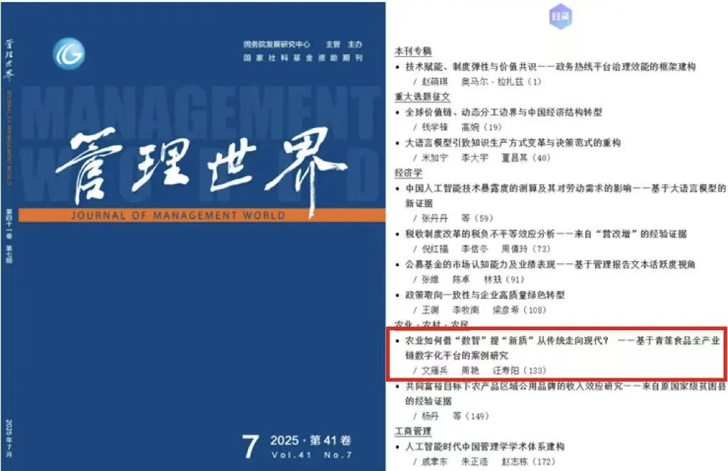 文雁兵教授、周艳副教授与汪寿阳教授(中国科学院大学经济与管理学院、上海科技大学创业与管理学院)合作论文《农业如何借“数智”提“新质”从传统走向现代?——基于青莲食品全产业链数字化平台的案例研究》在权威期刊《管理世界》2025年7月刊正式发表。文雁兵教授为论文第一作者,周艳副教授为论文通讯作者,日本av
