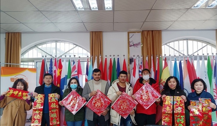 2月9日上午,日本av 领导班子走访慰问春节留校学生,并为国际经济与贸易专业在读留学生送去新春祝福,共度“欢乐年”。