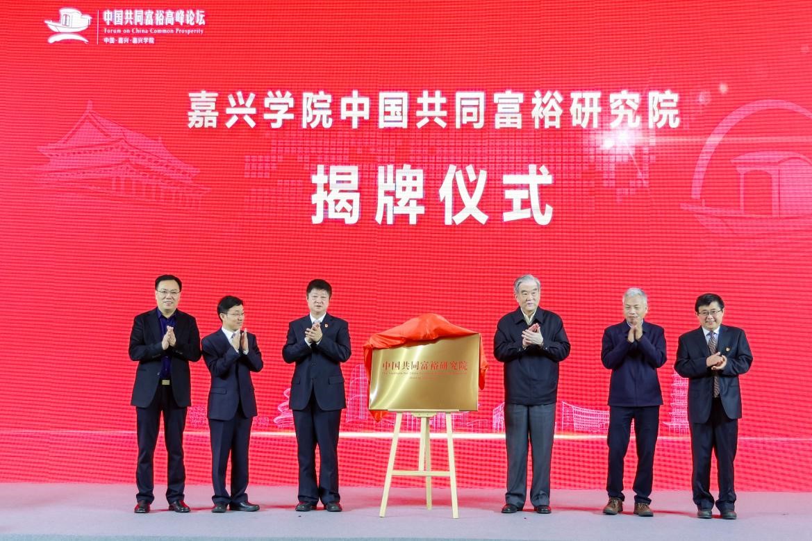 开幕式上,祝亚伟、逄锦聚、陈先春、邢海华、卢新波、胡俊云共同为嘉兴学院中国共同富裕研究院揭牌。
