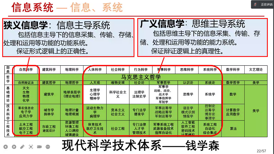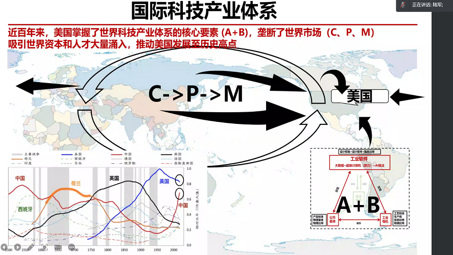 在讲授“产业体系”时,陆军指出,面向2035年,中国要发展的是ABCPM模型的科技产业体系(A:公基母机;B:实验样机;C:制造设施;P:产品;M:市场)。他以国际科技产业体系为例,介绍了中国、美国、英国、荷兰等国科技产业体系的发展,认为近百年来美国掌握了国际科技产业体系的核心要素(A+B),垄断了世界市场(C、P、M),而中国还是制造大国而非制造强国。他认为,中国已积累相对齐全的科技产业要素,进一步发展必须跳出美国的循环,构建以中国量子信息科技产业体系内循环为主体,以国际循环为补充的双循环产业体系;必须超前布局,开辟新赛道,掌握产业链与高价值环节,抢占主导权。