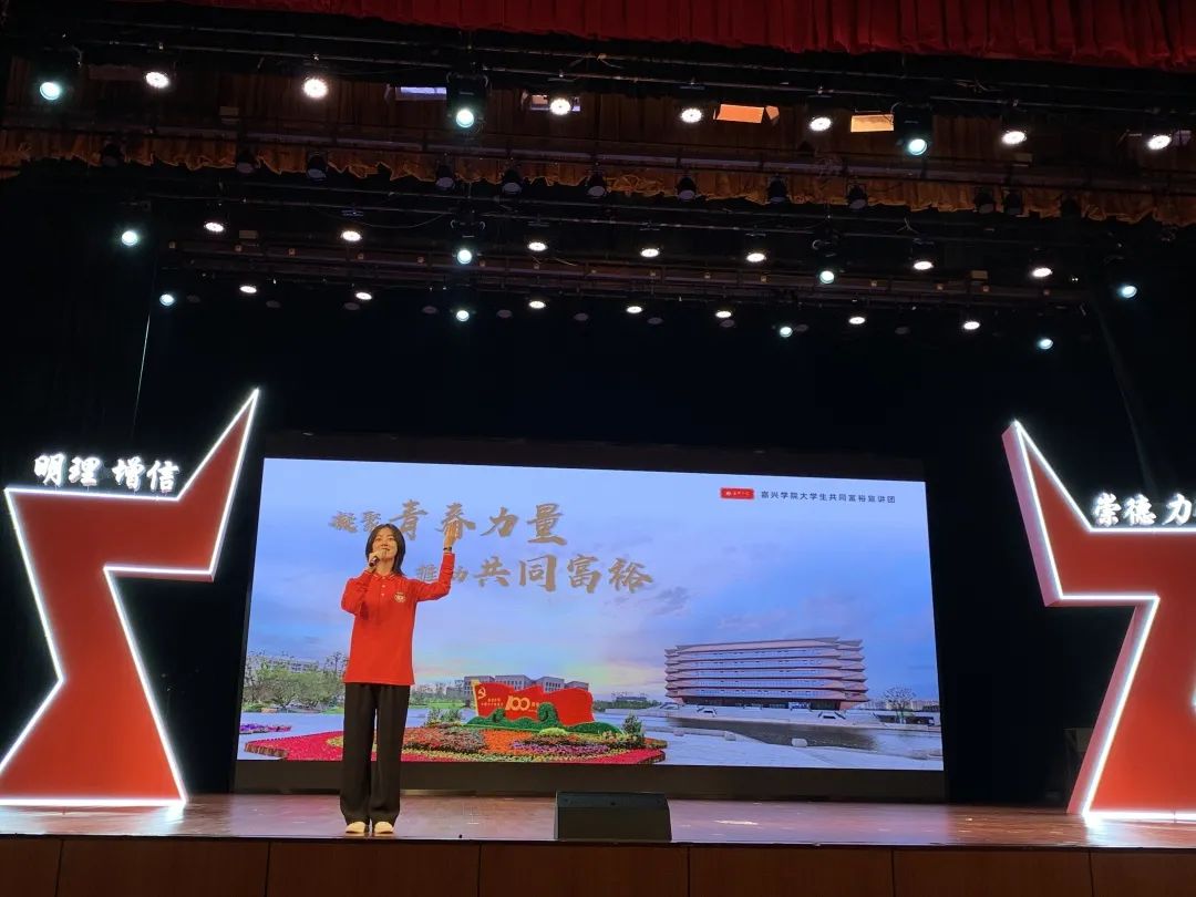 2020级经济学专业学生、嘉兴学院大学生共同富裕宣讲团成员潘吟笛进行了主题为《凝聚青春力量 推动共同富裕》的首次宣讲,内容涵盖共同富裕的意义和本质,浙江高质量建设共同富裕示范区的任务和举措,嘉兴建设共同富裕示范区典范城市的案例和成效。