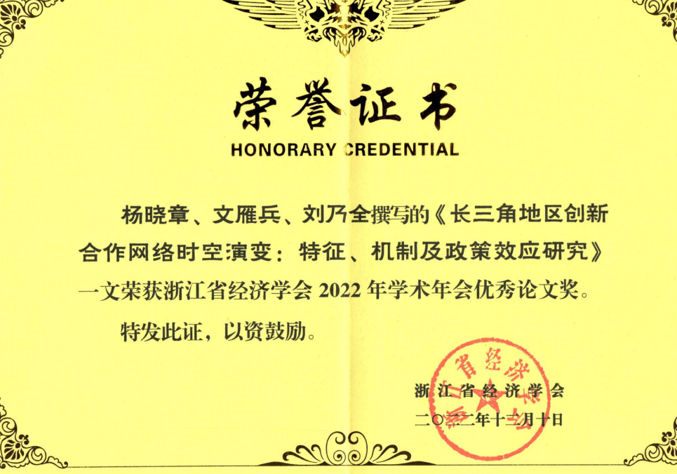 本次学术年会共征集近百篇高质量论文,其中48篇论文入选线上分论坛交流。经本届年会组委会专家严格评审,日本av 杨晓章博士递交的学术论文《长三角地区创新合作网络时空演变:特征、机制及政策效应研究》荣获浙江省经济学会2022年学术年会优秀论文奖。