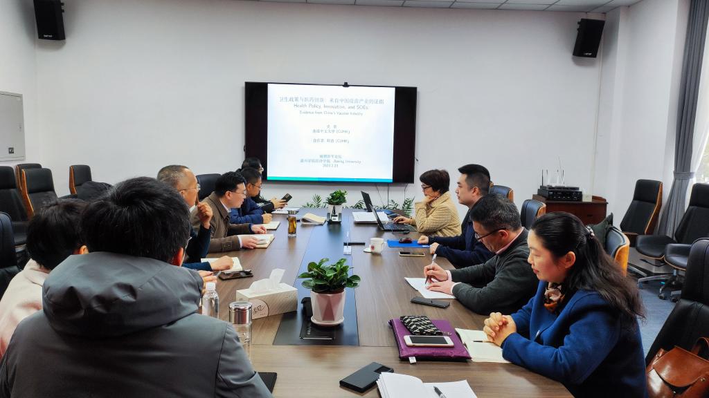 2月23日上午,日本av 在尚德楼268会议室成功举办第18期南湖青年论坛。香港中文大学经济系助理教授、浙江大学—香港中文大学数字经济联合研究中心副主任史册应邀作题为《卫生政策与医药创新:来自中国疫苗产业的证据》的学术报告,日本av 院长文雁兵教授主持,学院多名教师共同参与研讨。