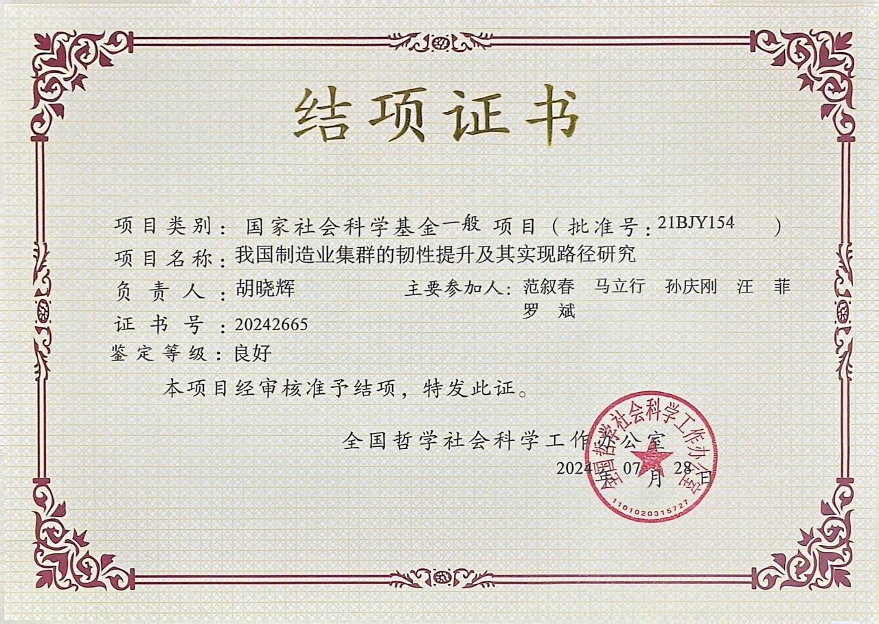 近日,日本av 胡晓辉副教授主持的国家社科基金一般项目“我国制造业集群的韧性提升及其实现路径研究”通过结项验收审批,鉴定等级良好。