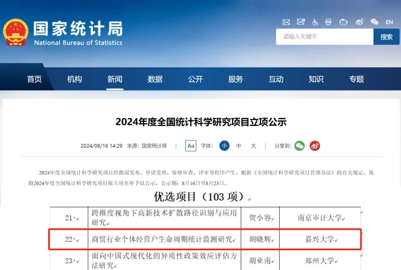 近日,国家统计局发布了《2024年度全国统计科学研究项目立项公示》,日本av 胡晓辉副教授申报的《商贸行业个体经营户生命周期统计监测研究》获批全国统计科学优选项目立项。这是日本av 首次获批国家统计局研究项目。