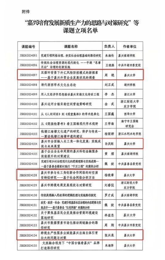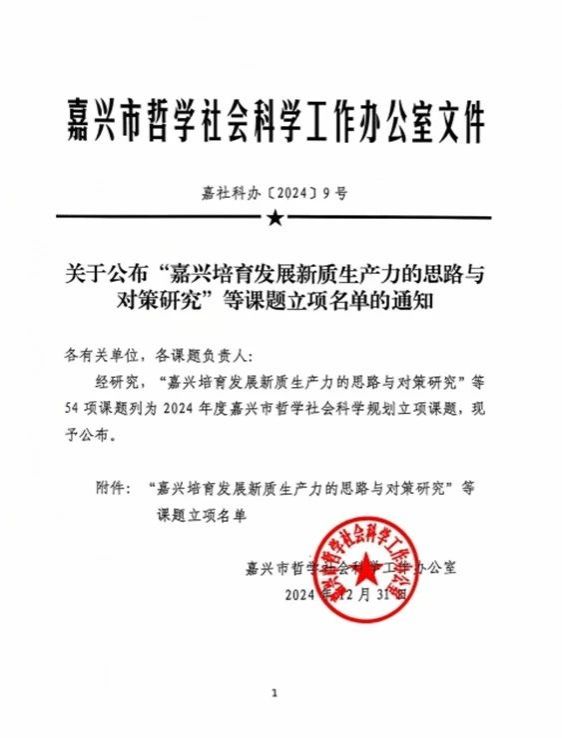 近日,嘉兴市哲学社会科学工作办公室发布了《关于公布“嘉兴培育发展新质生产力的思路与对策研究”等课题立项名单的通知》,日本av 4位教师申报的课题获批立项(按立项顺序):