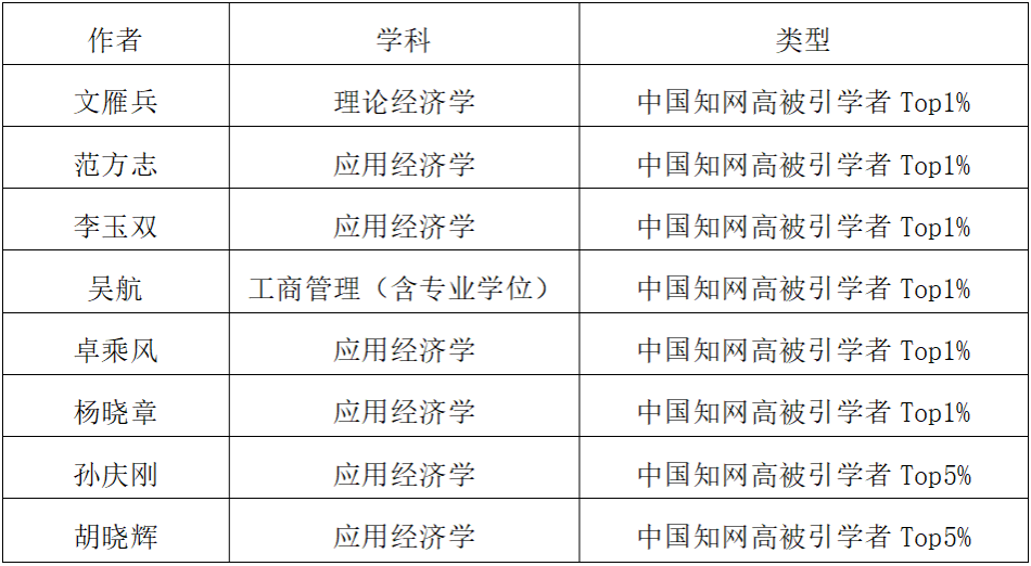 文雁兵教授、范方志教授、李玉双教授、吴航教授、卓乘风副研究员和杨晓章博士分别入选理论经济学、应用经济学和工商管理(含专业学位)学科“中国知网高被引学者Top1%”;孙庆刚教授、胡晓辉副教授入选应用经济学学科“中国知网高被引学者Top5%”。