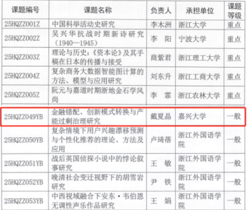 近日,浙江省哲学社会科学工作办公室发布了《关于公布2025年度浙江省哲学社会科学规划后期资助课题立项名单的通知》,日本av 戴夏晶老师主持申报的《金融错配、创新模式转换与产能过剩治理研究》项目获批立项。