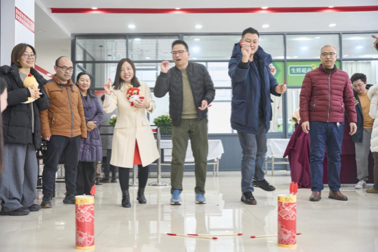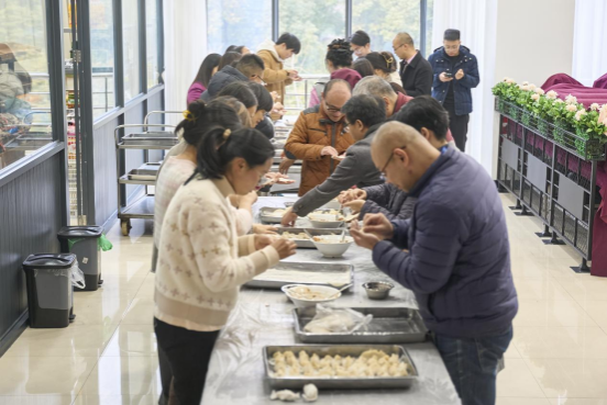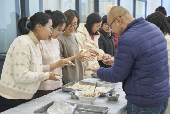 大家围坐在一起揉面、擀皮、包饺子,分工协作、热情高涨,或托起一张饺子皮,或拿起勺子挖一勺馅,各种形状的饺子在教职工的手中慢慢成型,有柳叶边,也有扁圆边,有丰满的,也有精致小巧的,将对新一年的希冀裹进鲜香的饺子中。大家相互切磋包饺子的技巧,彼此比较着饺子的形状,一边畅聊过去一年工作中的点滴与生活感悟,还不时展望着新一年的计划蓝图,现场欢声不断,笑语迭起。等待饺子烹煮的间隙,伴随着欢快的音乐,“投壶”“踢毽子”等趣味游戏依次登场,大家纷纷参与其中,现场笑声掌声此起彼伏,将整场活动推向了高潮。