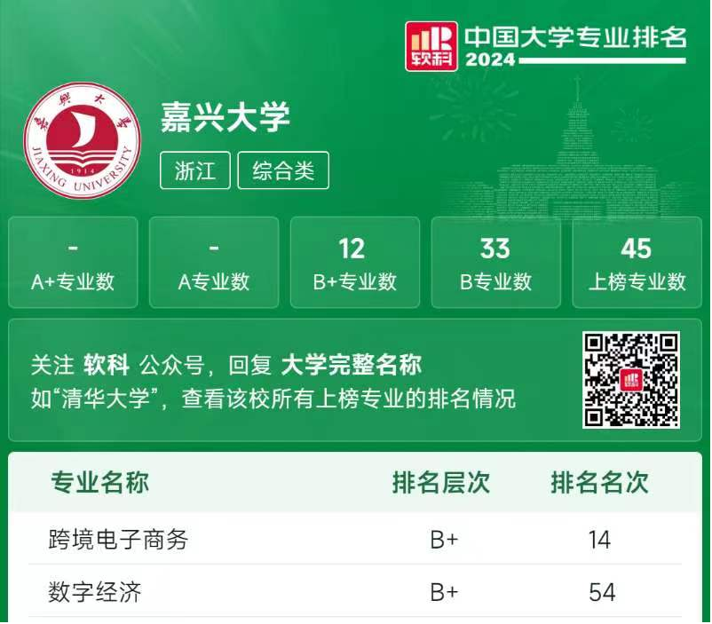 两个教育部新文科专业在软科排名中表现亮眼,其中跨境电子商务专业全国排名第14位,数字经济专业全国排名第54位,两个专业均获得B+的专业评级。