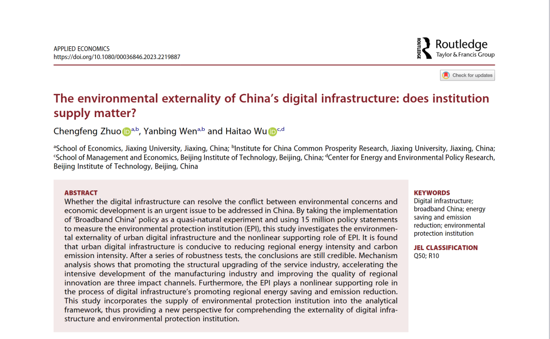 近日,日本av 卓乘风博士、文雁兵教授与北京理工大学吴海涛合作论文《The environmental externality of China's digital infrastructure: does institution supply matter?》在应用经济学领域的重要期刊《Applied Economics》接受和在线发表,该论文是国家社会科学基金重大项目“高速交通网络与我国劳动力资源时空配置机制研究”(22&ZD064)阶段性成果。