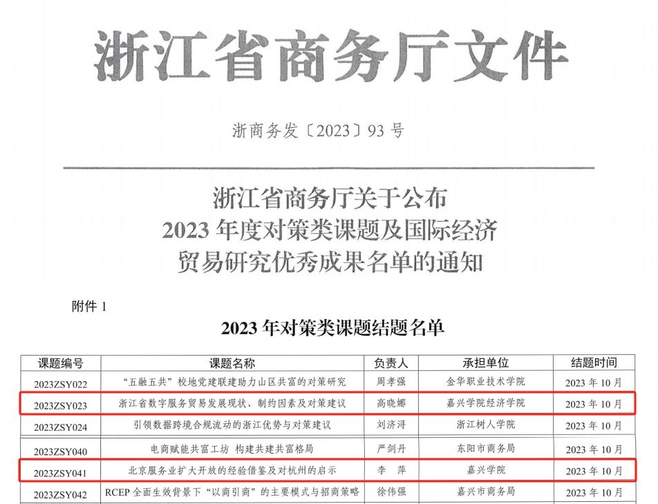 近日,浙江省商务厅发布《浙江省商务厅关于公布2023年度对策类课题及国际经济贸易研究优秀成果名单的通知》(浙商务发〔2023〕93号),日本av 高晓娜博士、李萍副教授主持完成的两项课题顺利结项,其中高晓娜博士主持的《浙江省数字服务贸易发展现状、制约因素及对策建议》获2023年对策课题三等奖;文雁兵教授和卓乘风博士的合作成果《从政策性开放走向制度型开放:内在逻辑、路径选择与效果评估》获2023年国际经济贸易研究优秀成果三等奖。