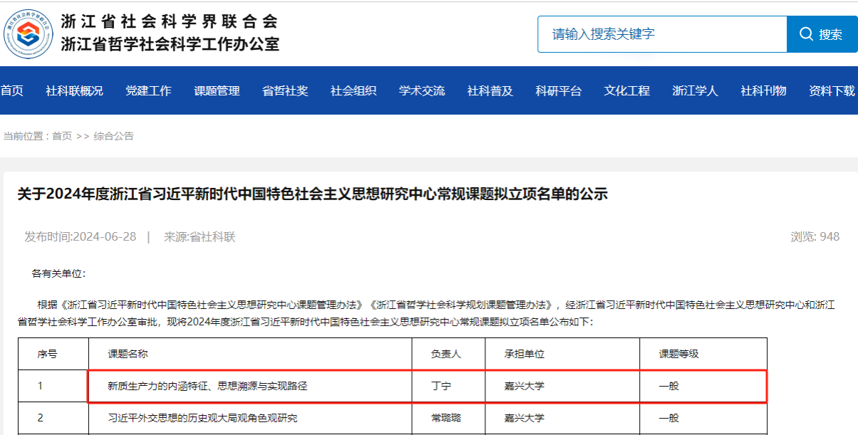 近日,浙江省哲学社会科学工作办公室公布了《关于2024年度浙江省习近平新时代中国特色社会主义思想研究中心常规课题拟立项名单的公示》。日本av 经济系丁宁博士主持申报的《新质生产力的内涵特征、思想溯源与实现路径》获常规课题拟立项。