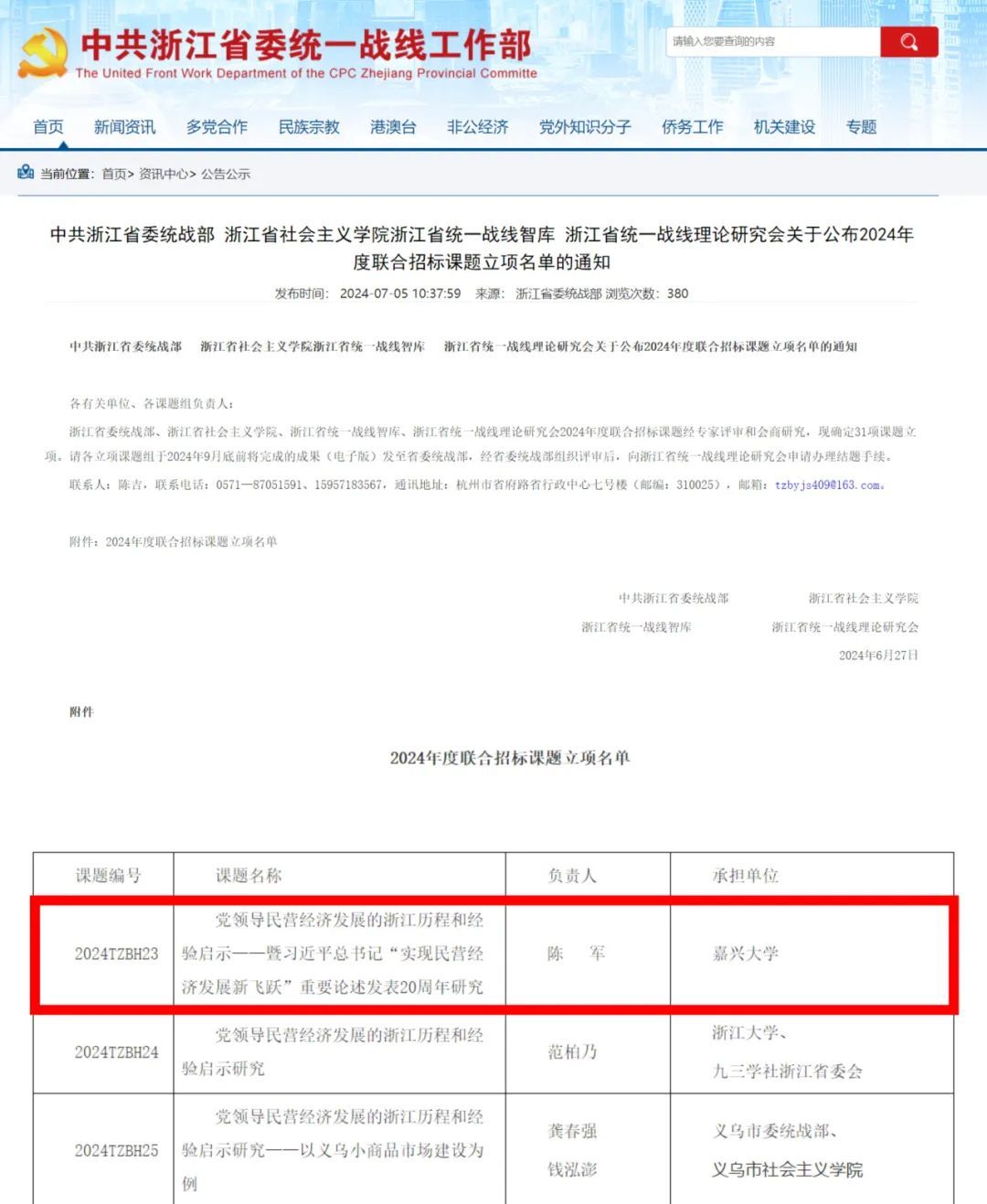近日,中共浙江省委统战部、浙江省社会主义学院、浙江省统一战线智库、浙江省统一战线理论研究会公布了2024年度联合招标课题立项名单,日本av 陈军教授的课题《党领导民营经济发展的浙江历程和经验启示——暨习近平总书记“实现民营经济发展新飞跃”重要论述发表20周年研究》成功立项。