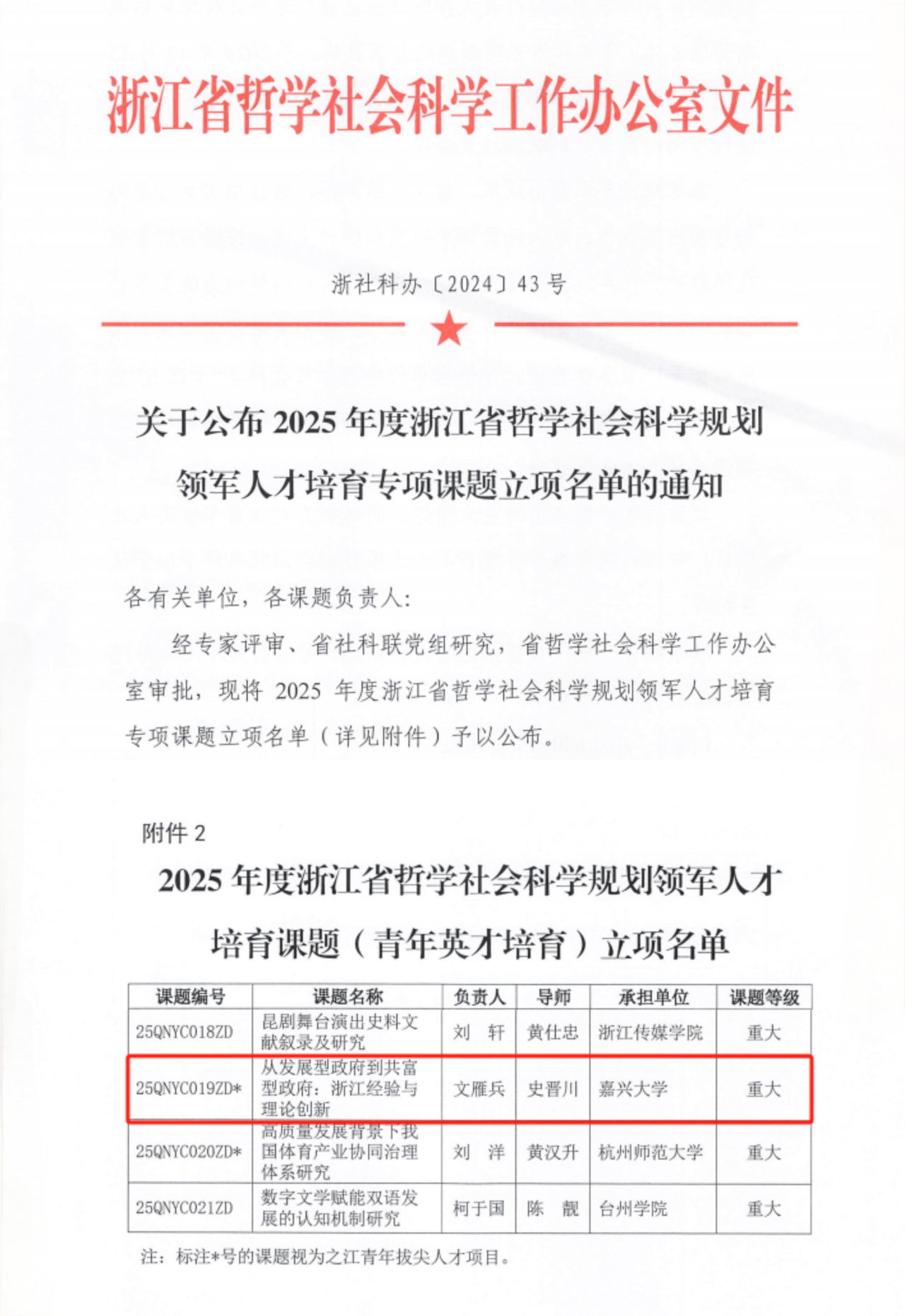 近日,浙江省哲学社会科学工作办公室公布了2025年度浙江省哲学社会科学规划领军人才培育专项课题立项名单,日本av 文雁兵教授主持申报的《从发展型政府到共富型政府:浙江经验与理论创新》获2025年度浙江省哲学社会科学规划领军人才培育课题(青年英才培育)立项。