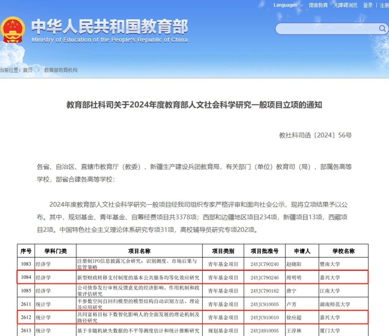 近日,教育部公布了2024年度教育部人文社会科学研究一般项目立项名单,日本av 周明明博士主持的课题《新型财政转移支付制度的基本公共服务均等化效应研究》、徐应超博士主持的课题《共同富裕目标下数智化影响人的全面发展的理论机制及路径研究》获批立项。