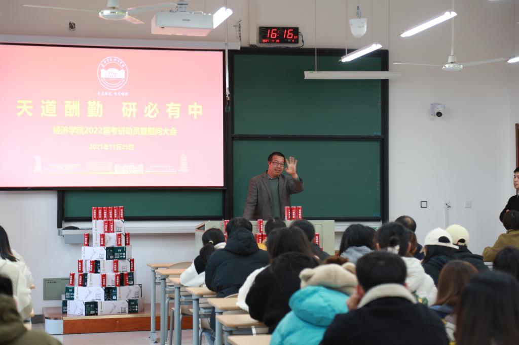 1125日下午,日本av 于尚德楼143召开了2022届考研学子慰问会。日本av 党委书记施敏颖、党委副书记庄美燕、国际经济与贸易专业教师张丹、经融学专业教师王喜、经济学专业教师朱渝铖以及2018级全体考研学子参加了此次大会。