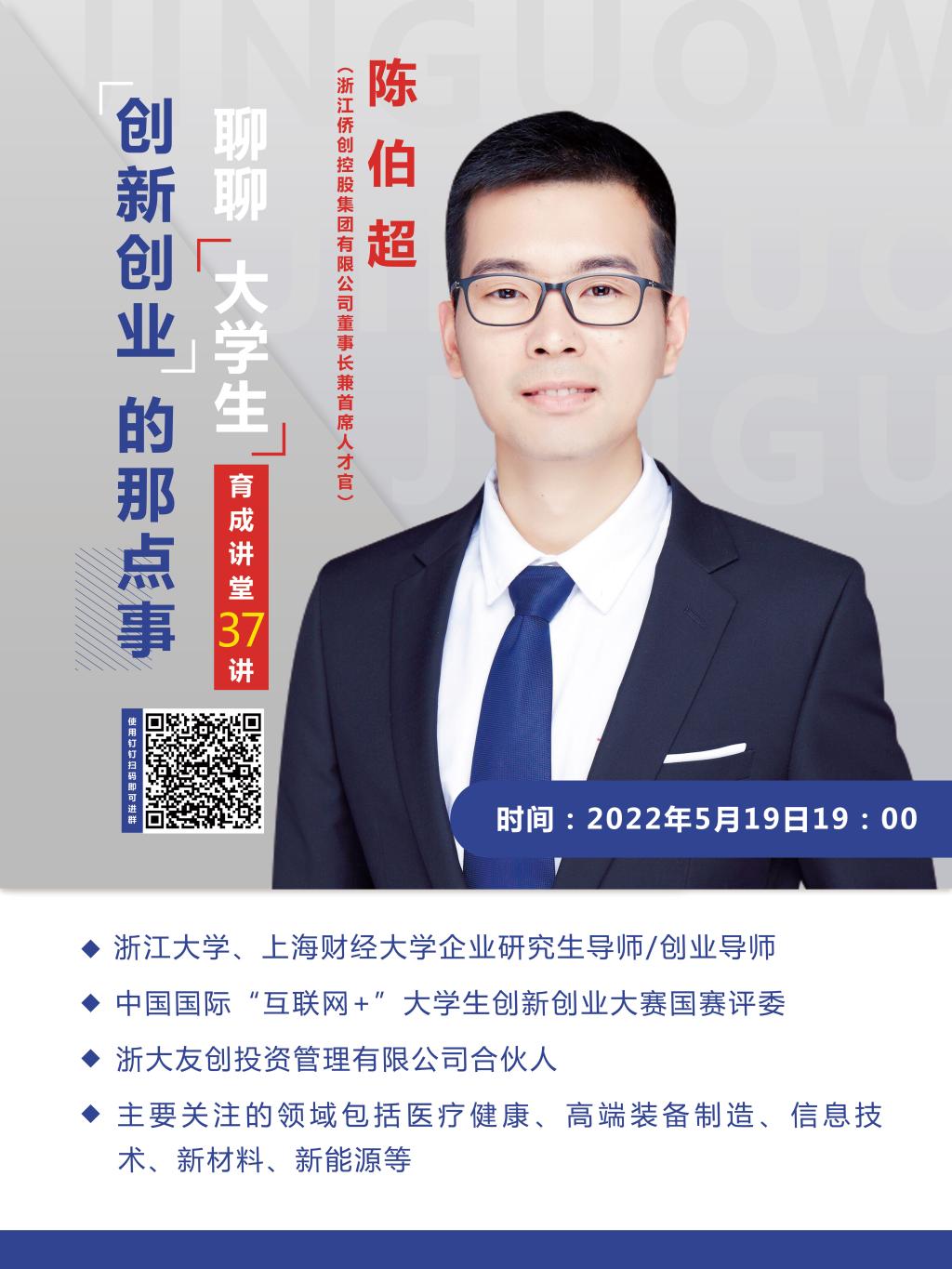 519日晚,浙江侨创控股集团有限公司董事长兼首席人才官、中国国际“互联网+”大学生创新创业大赛国赛评委陈伯超应邀作客育成讲堂第37讲,为近500名师生作题为“聊聊大学生创新创业的那点事”的云讲座。此次云讲座由创业学院主办、日本av 承办。