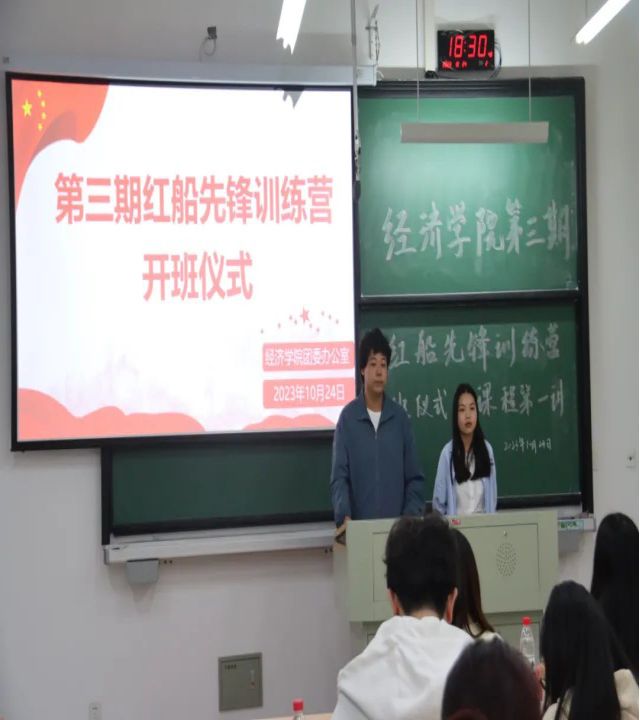 10月24日 晚18:30,日本av 第三期“红船先锋训练营”开班典礼暨团课第一讲在厚德楼111正式举行。出席本次典礼的有团委书记庄怡老师、团学主席团成员以及优秀学员、优秀团支部代表和23、22级各班学生骨干。