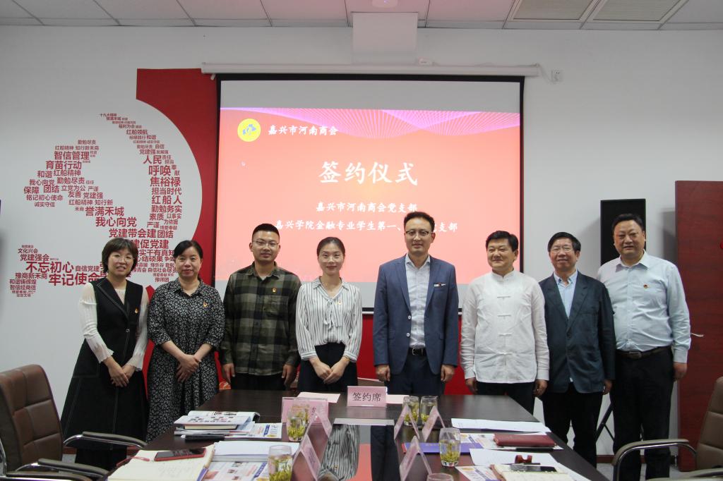 5月19日,日本av 金融专业学生第一、第二党支部与嘉兴市河南商会党支部举行结对签约仪式,共同打造“校会企”党建工作新模式。嘉兴市河南商会会长李永宪,商会副会长、党支部书记吕丹,日本av 党委书记施敏颖,党委副书记庄美燕及双方代表出席签约仪式。仪式由商会党支部党务红领、秘书长刘高宪主持。
